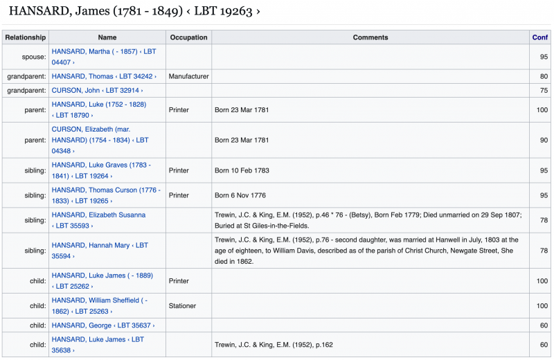 In addition to all the famous names of the book trade up to the mid-nineteenth century, entries offer information for more minor figures including family members and apprentices. There are entries for nearly 35,000 people, presenting detailed accounts of the person’s interaction with the Stationers’ Company and data from published sources. Family relationship tables enable the tracing of family dynasties, often through several generations in the trade, by using the links to grandparents, parents, and children, for example the Hansard printing dynasty.