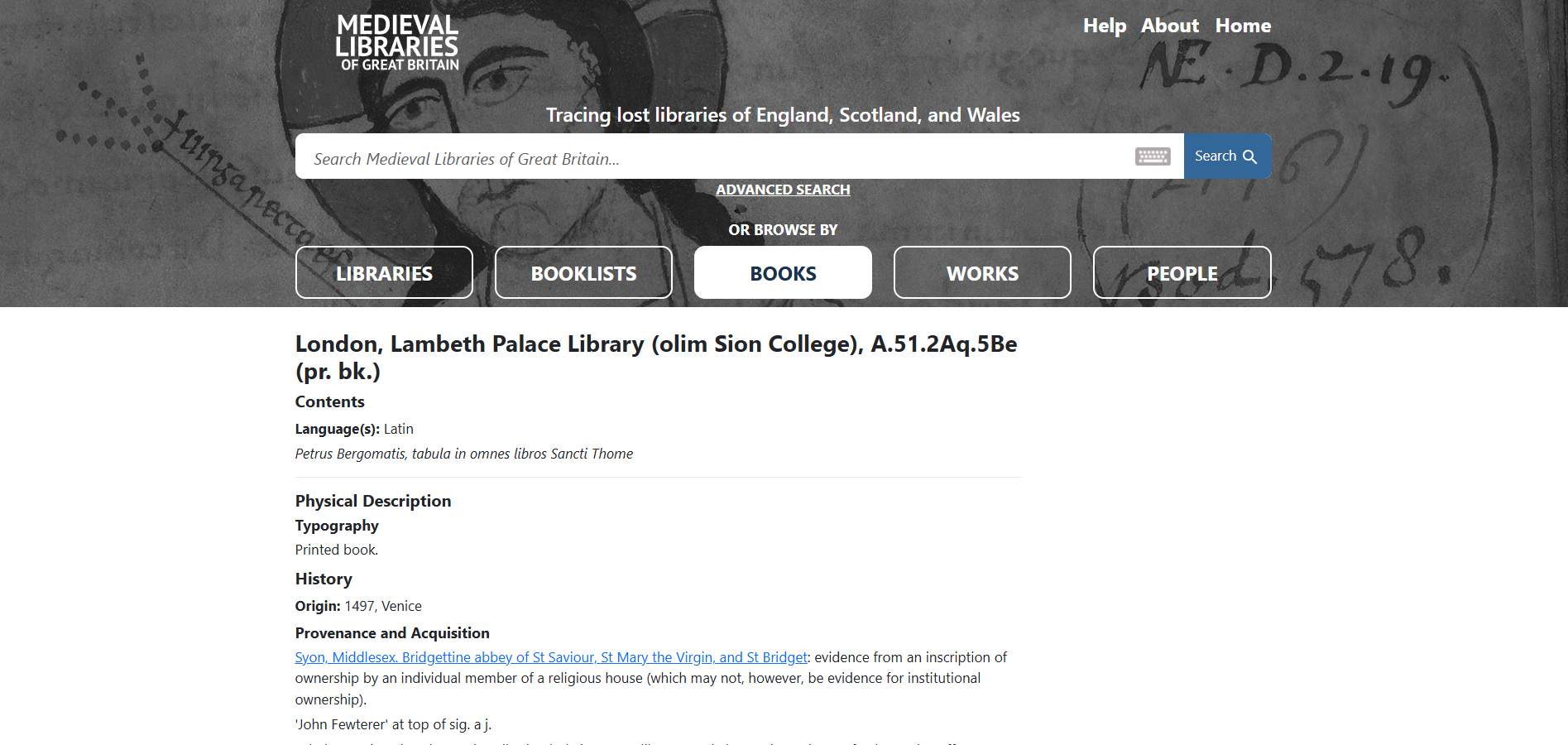 In the spirit of the renewed year, one renewed Bodleian resource is sure to delight those interested in medieval libraries: the newly re-released Medieval Libraries of Great Britain database. MLGB, as it is now commonly known, aims to list every manuscript and printed book associated with an institutional library during the Middle Ages, either by citing internal evidence, or by referencing the medieval library catalogues and booklists published by the Corpus of Medieval British Library Catalogues series.